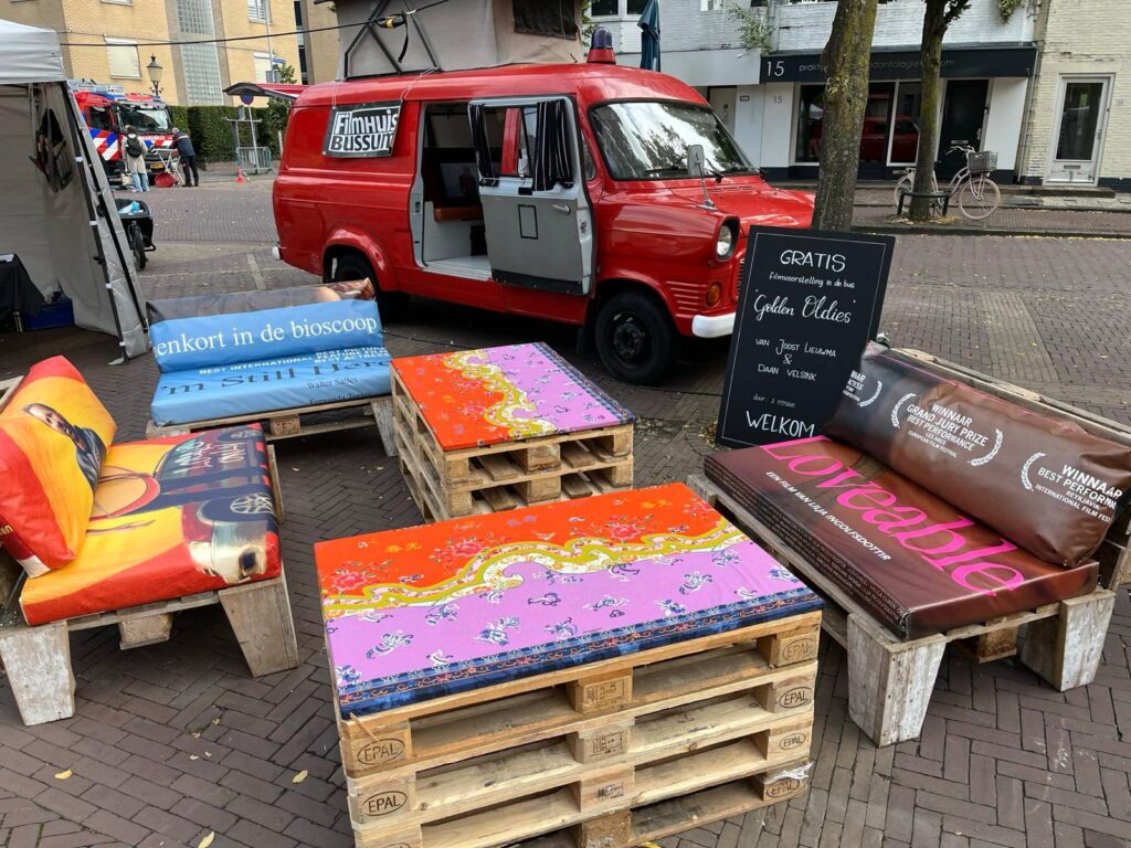 Voor het festival Bussum Cultureel maakten we palletkussens die gemaakt zijn van oude reclame banners van het filmhuis. De tafels hebben we bekleed met een oud tafelkleed.